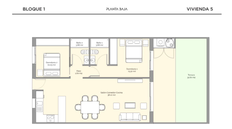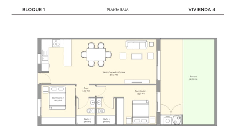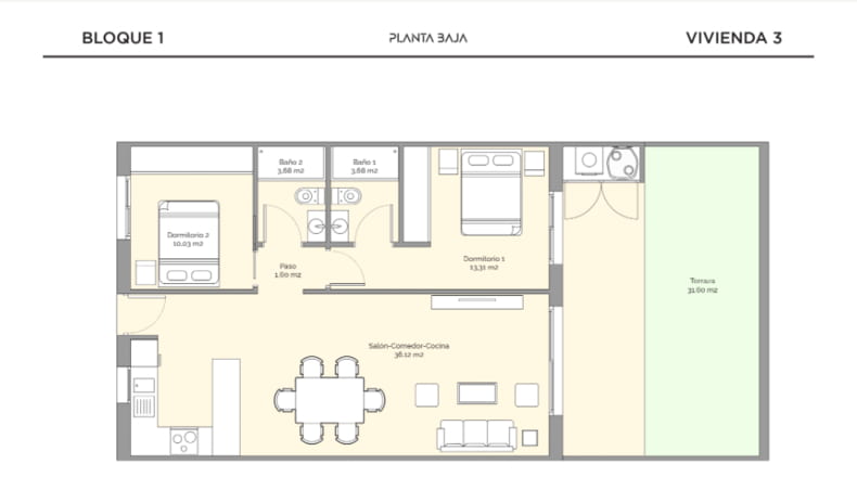 Piso de obra nueva de 2 dormitorios, 2 baños con superficie 100 m² construidos. La vivienda cuenta con las siguientes comodidades: Armarios empotrados, Cabina de ducha, Piscina comunitaria, Ventanas exterior, Terraza, Cocina Americana (Amueblada).